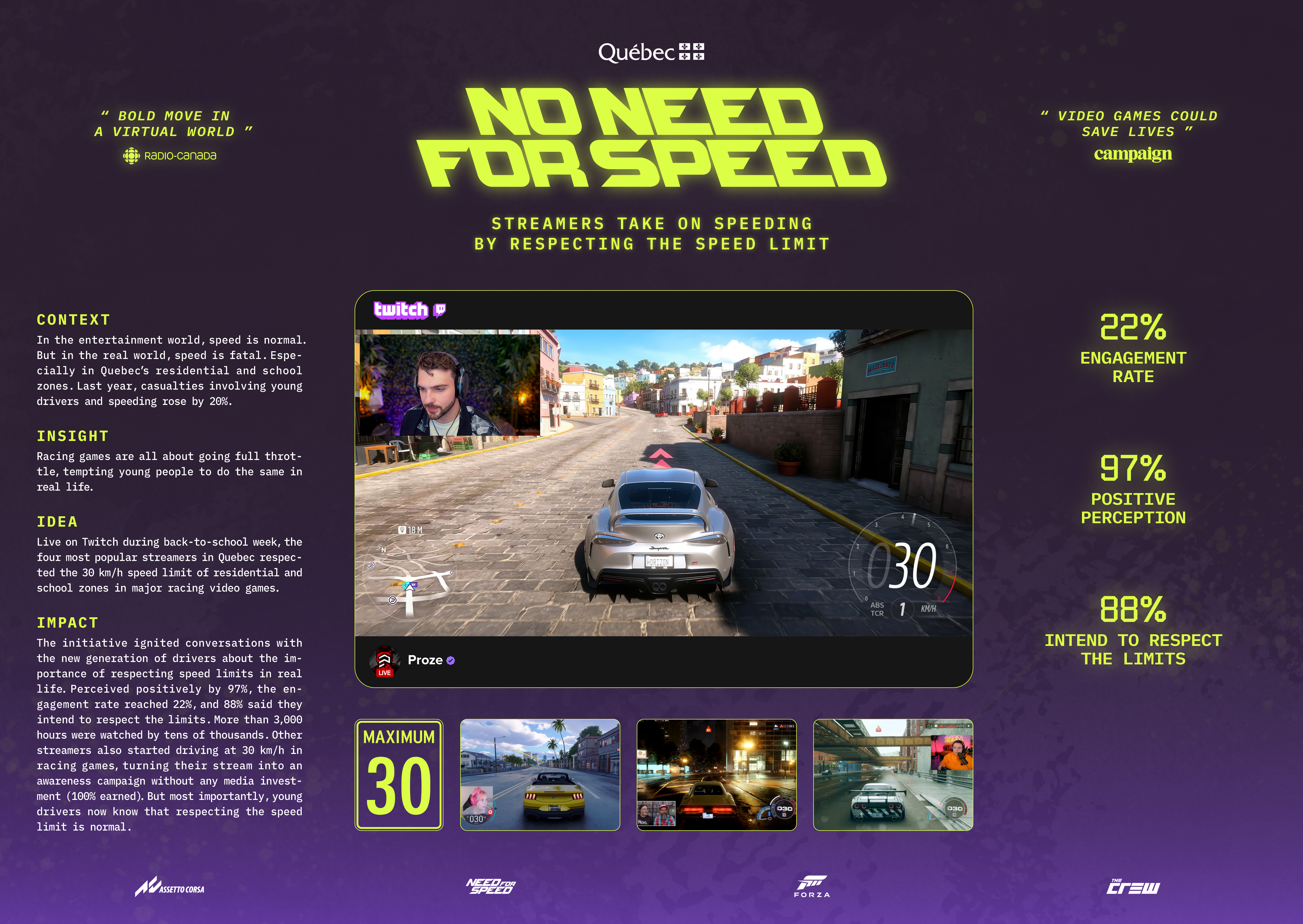 The idea was to challenge indifference and inspire young Quebec drivers to take a closer look at their driving habits. The SAAQ launched “No need for speed.” The 100% digital initiative literally put the brakes on speeding by infiltrating the province's most popular gamers' content.